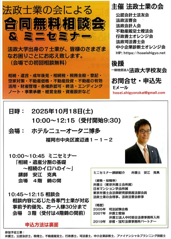 お申し込みは、hosei.shigyonokai@gmail.comまで。メールタイトルに「福岡 合同相談会」とご記入ください。