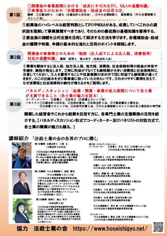 今年も法政大学リカレント教育オフィス主催公開講座、法政士業の会提供の「起業家のためのステップアップ講座」を行います。(お申し込みは150名先着順