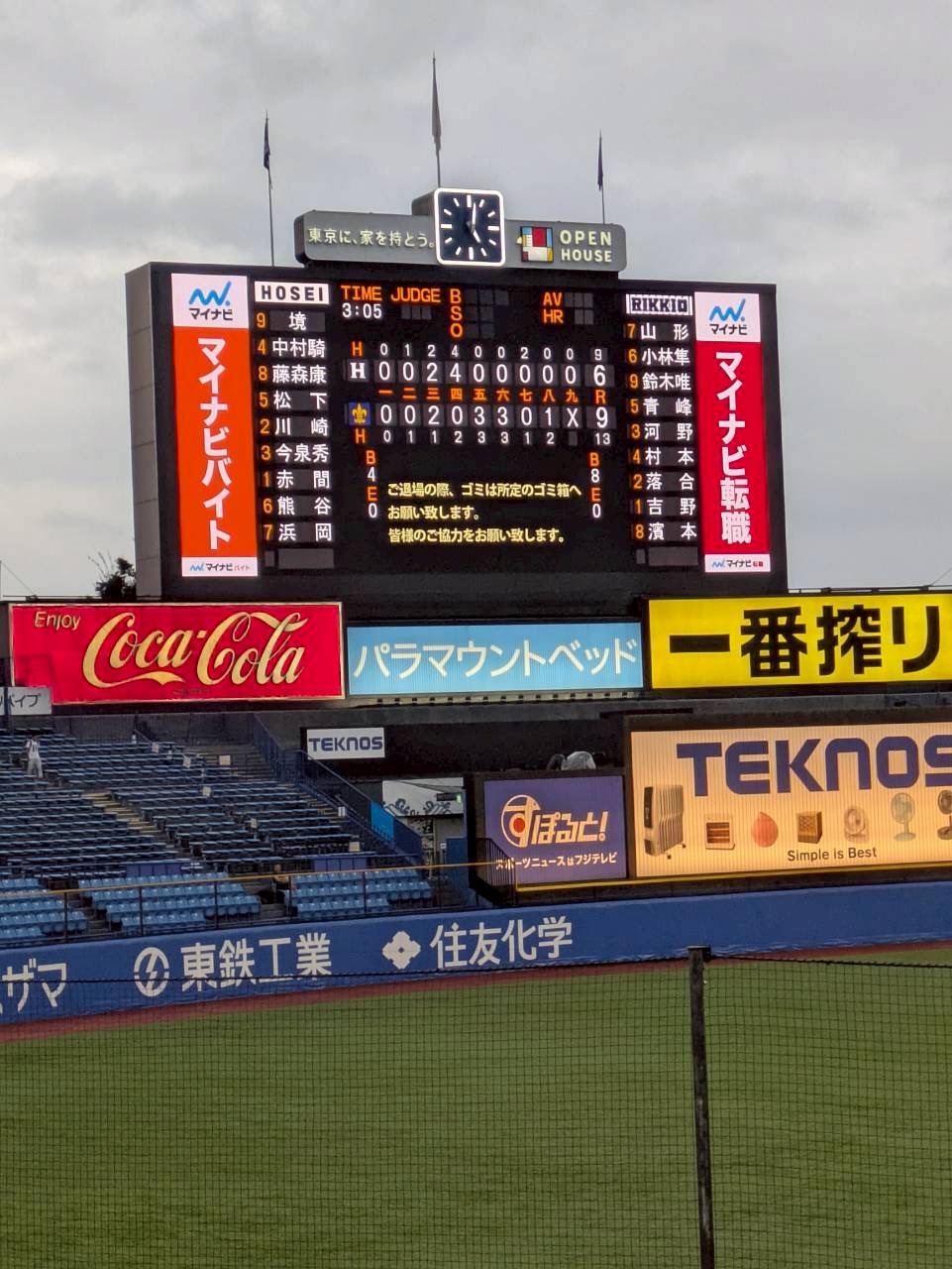 試合のほうは、4回までは6-2とリードしていましたが、立教大学が5回、6回、8回に追加点を入れて9-6の逆負けとなってしまいました。