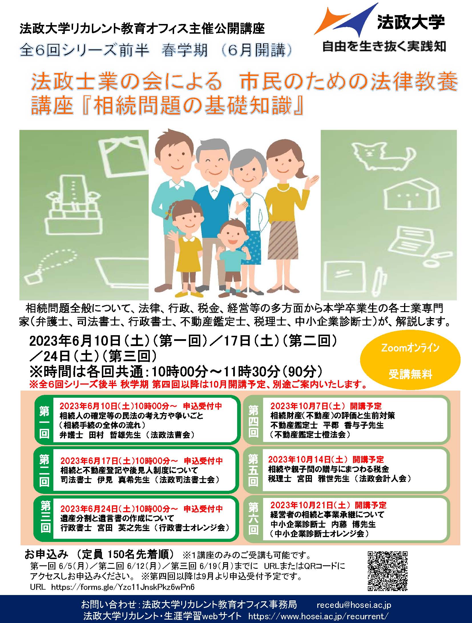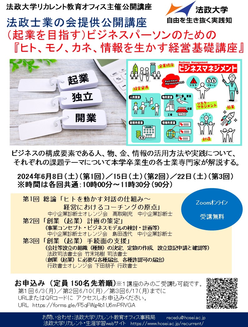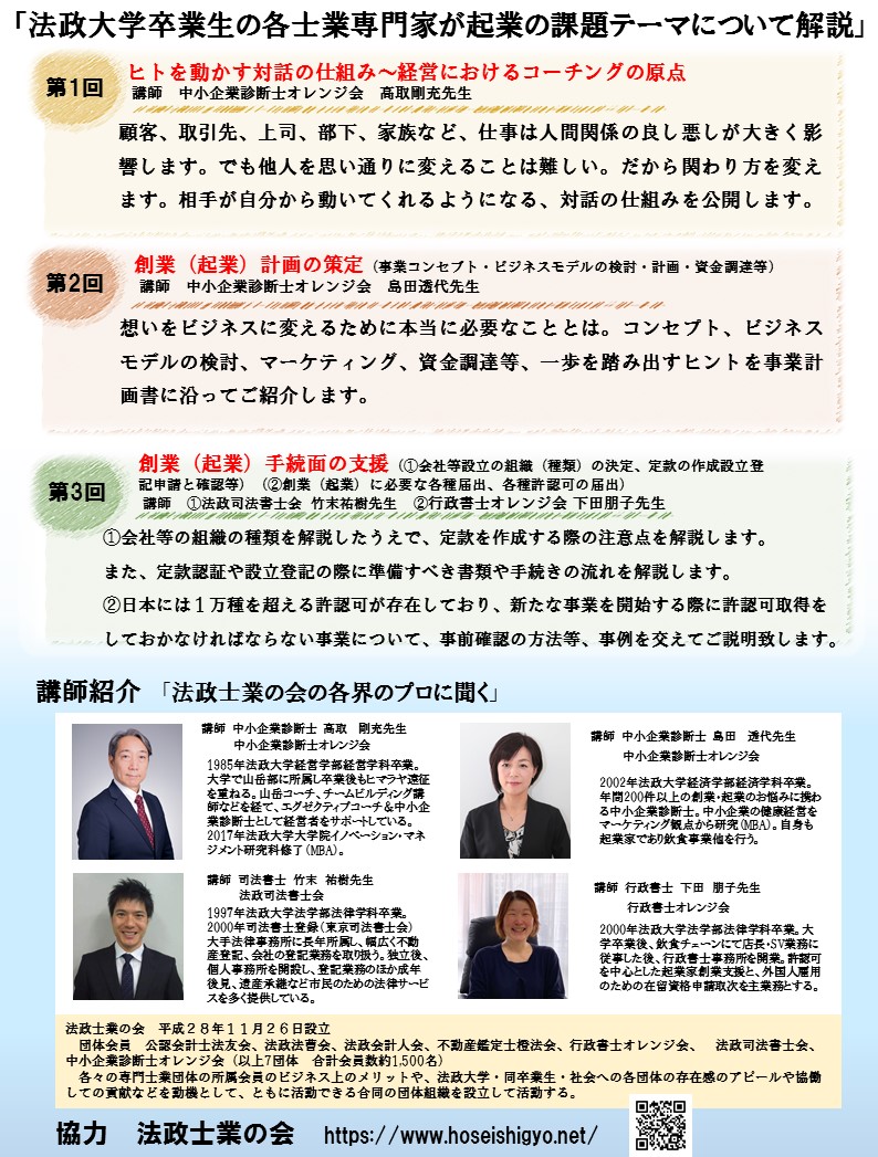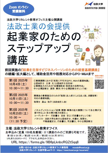 今年も法政大学リカレント教育オフィス主催公開講座、法政士業の会提供の「起業家のためのステップアップ講座」を行います。(お申し込みは150名先着順
