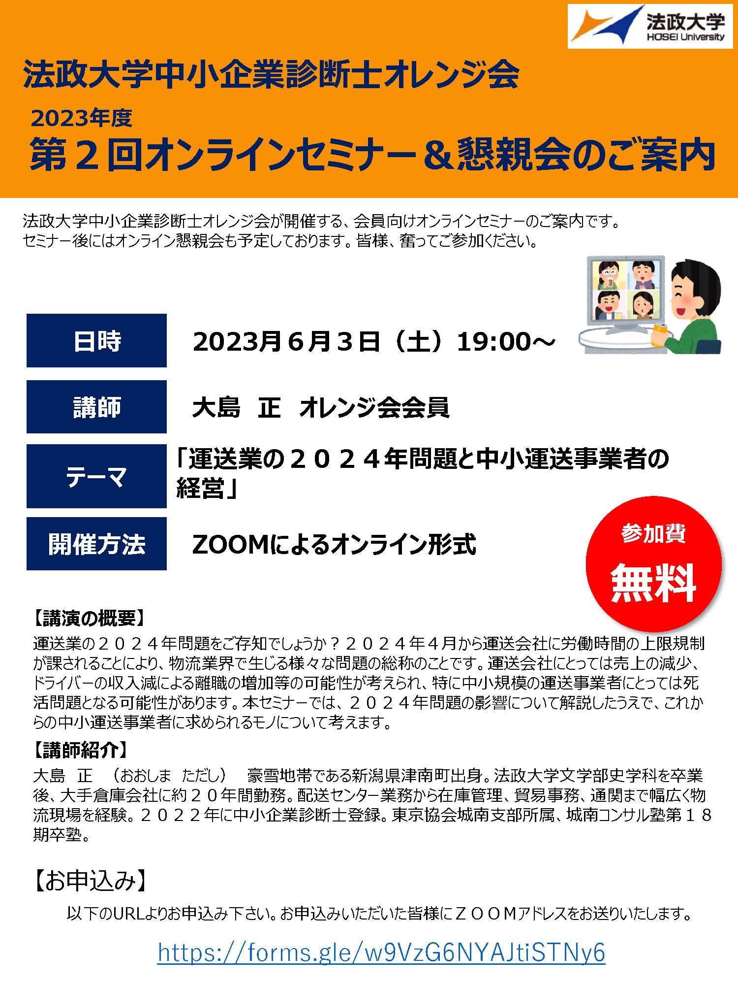 時節柄ご多忙とは存じますが、公認会計士法友会、法政法曹会、法政会計人会、不動産 鑑定士橙法会、行政書士オレンジ会、法政司法書士会、中小企業診断士オレンジ会の各会の 会員のみなさま、個人会員のみなさまの積極的なご参加を賜りたく、よろしくお願い申し上 げます。