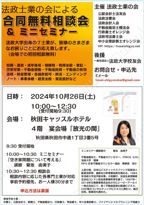 2024年法政大学全国卒業生の集い「秋田大会」において法政士業の会による合同無料相談会とミニセミナーを開催いたします。