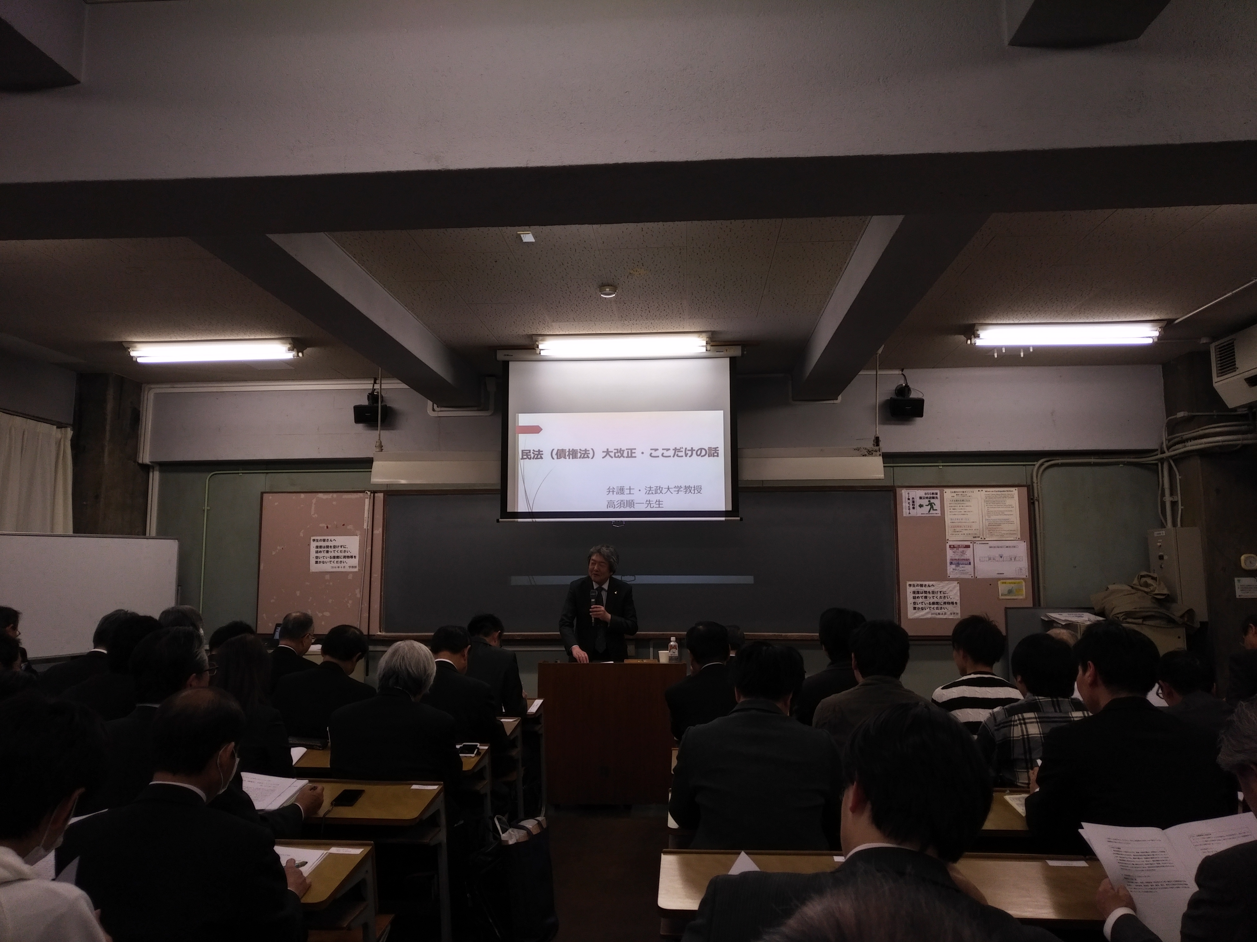 講師は高須順一先生(弁護士・法政大学大学院法務研究科教授)。講演タイトルは「民法(債権法)大改正・ここだけの話」