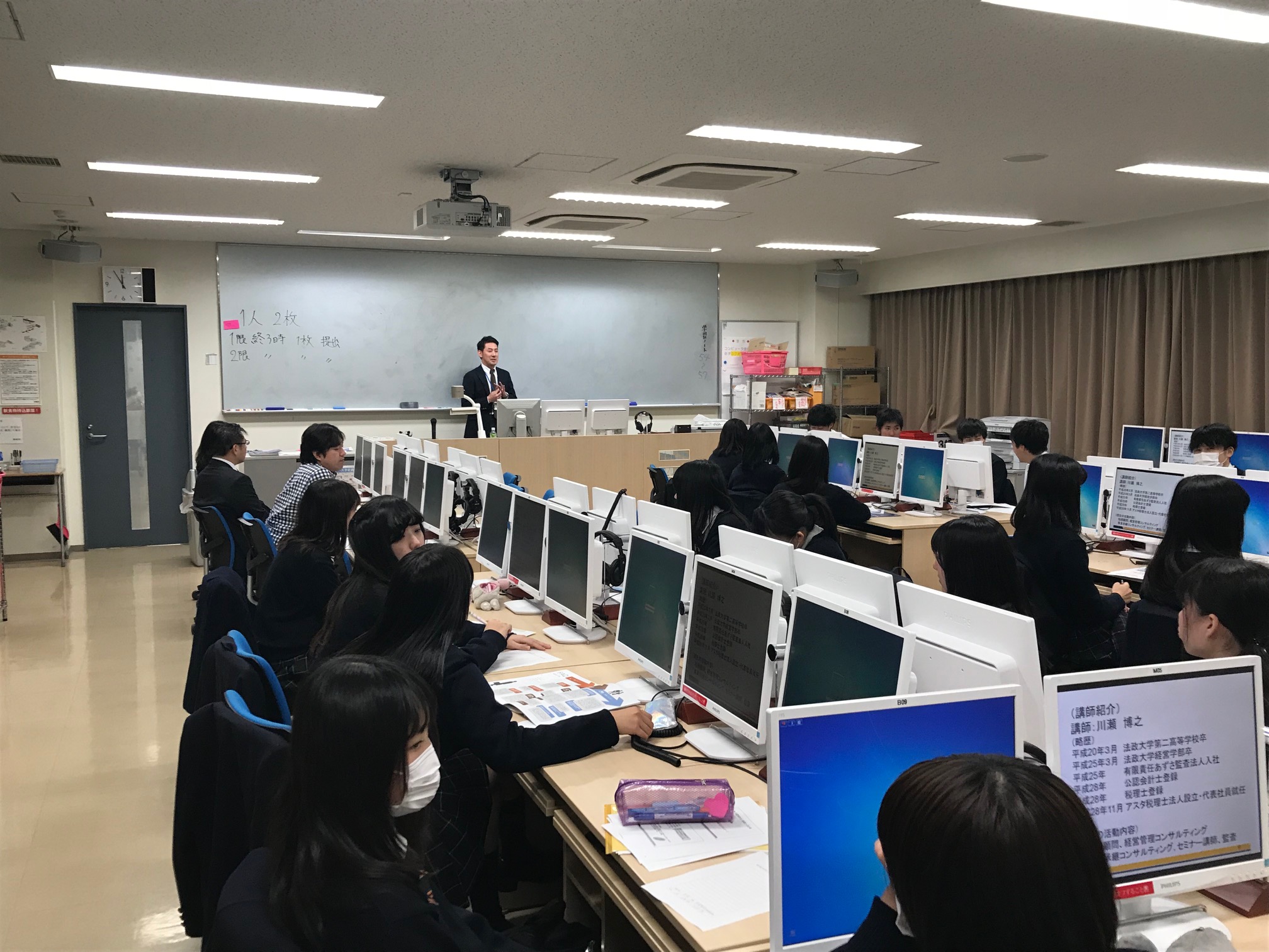 2月15日弁護士(高林さん)、不動産鑑定士(柘植さん)、公認会計士(川瀬さん)の講師により、法政大学高等学校の法学部、経営学部進学者の生徒さんたちにガイダンス講義を行いました。(会場:マルチメディア教室)